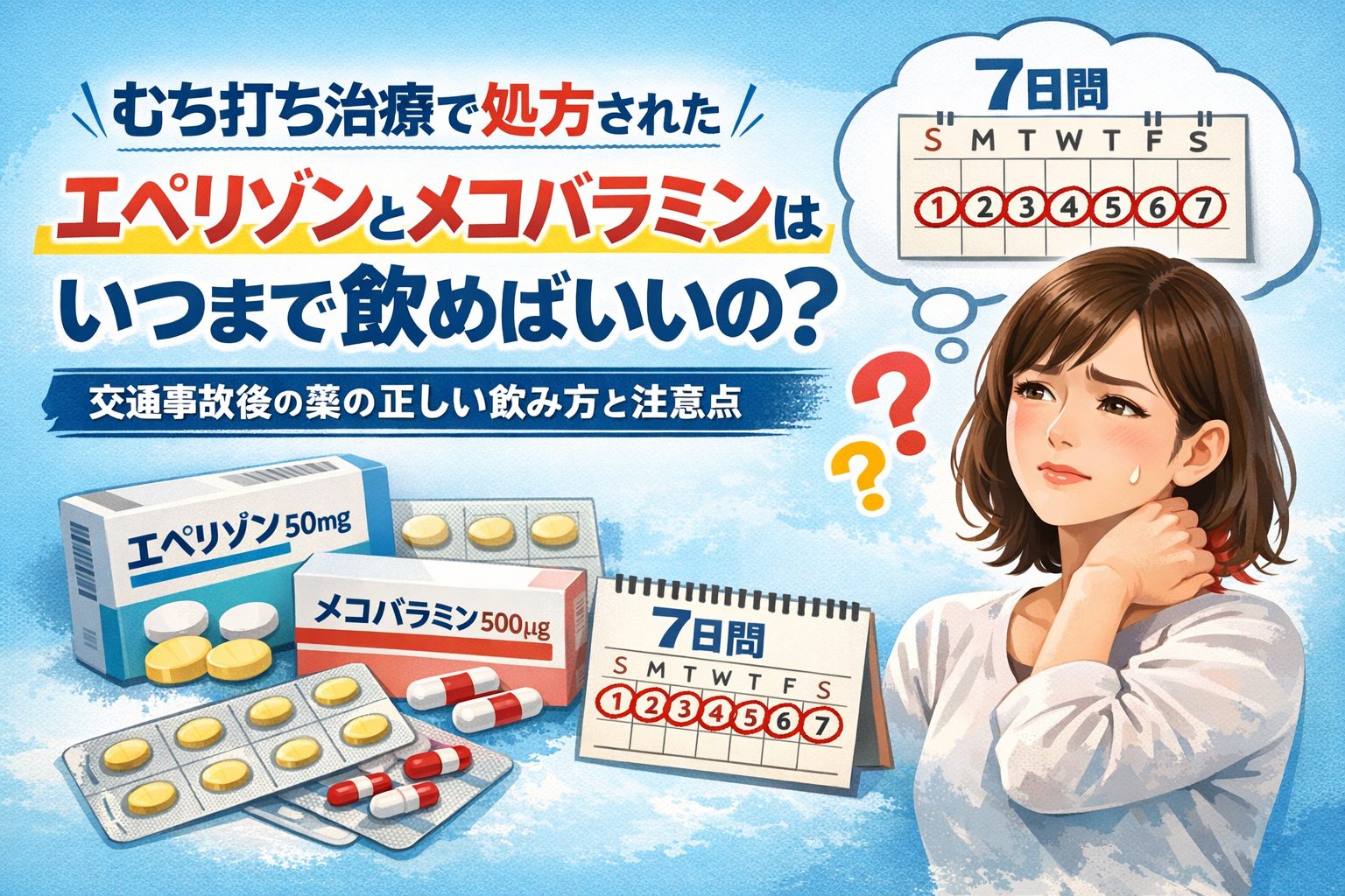 交通事故に遭い、むち打ち症と診断されると、痛みやだるさ、首のこわばりに不安が募りますよね。「エペリゾン」や「メコバラミン」という薬を処方されたけれど、7日分だけ出された薬をいつまで飲めばいいのか迷ってしまう方も多いと思います。