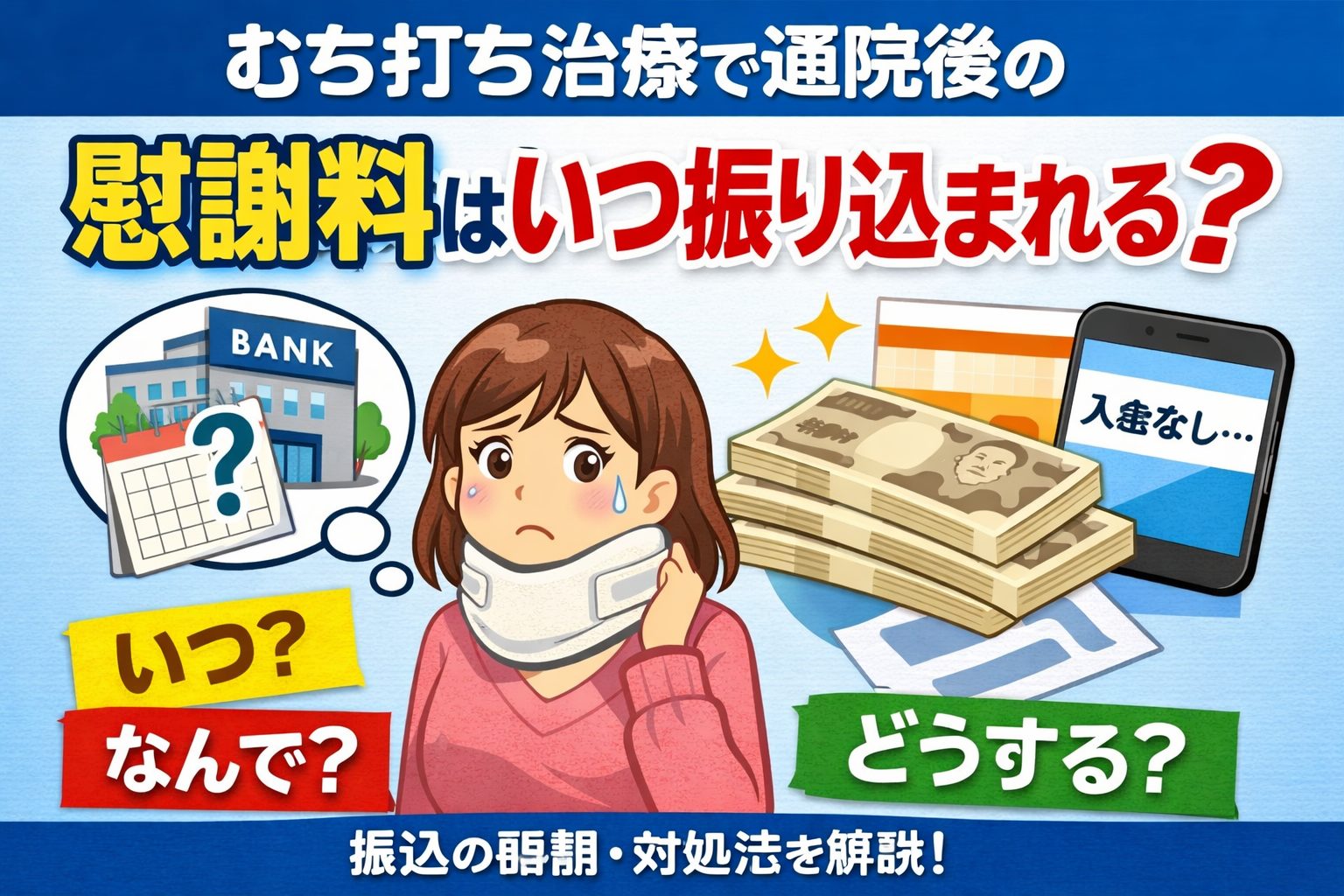 交通事故でむち打ちになり、辛い痛みと戦いながら通院を続けてこられたあなた。本当にお疲れ様でした。通院が終わってほっとしたのもつかの間、「慰謝料はいつ振り込まれるの?」と不安になることはありませんか?