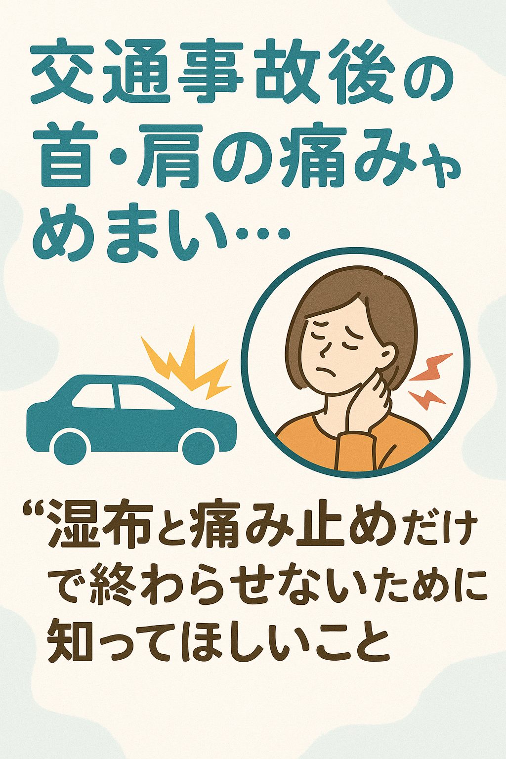 - むち打ちの痛みは、筋肉・靭帯の損傷や自律神経の乱れが関係しており、薬だけでは改善しないことが多いです。